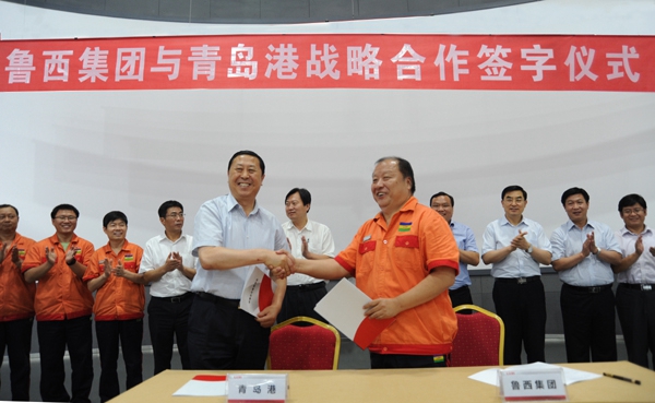 7月23日, 魯西集團與青島港(集團)有限公司戰略合作簽字儀式在魯西集團接待中心舉行。聊城市副市長洪玉振、市政府副秘書長陳長華、國資委主任張樹奎、高新區黨工委副書記周兆巖、集團公司董事長張金成及部分領導班子成員和青島港(集團)有限公司董事長鄭明輝等參加此次簽字儀式。