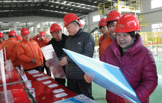 中國(guó)氮肥工業(yè)協(xié)會(huì)領(lǐng)導(dǎo)在聚碳酸酯裝置觀看企業(yè)的相關(guān)產(chǎn)品