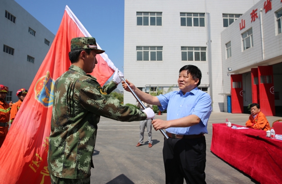 圖為任市長為魯西集團應急救援隊隊長授旗。