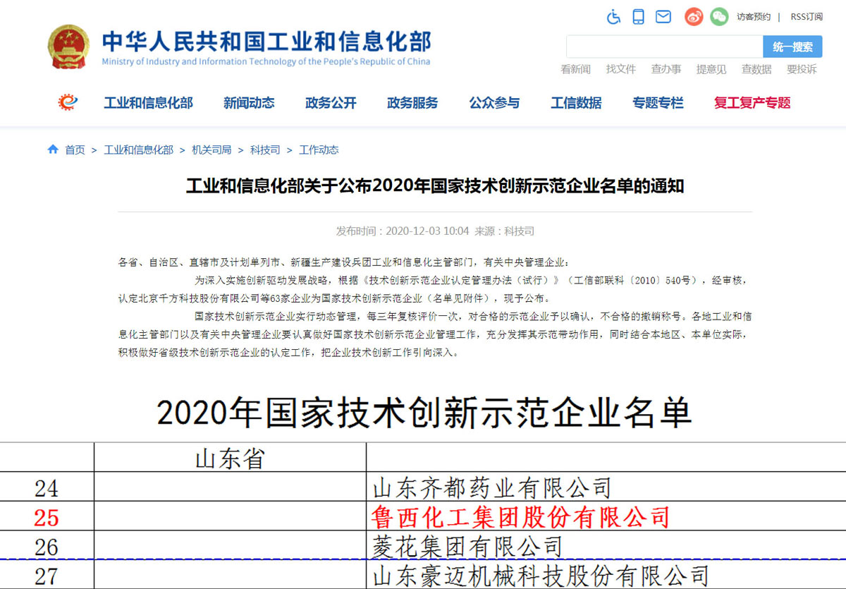 12月3日,工業和信息化部公布了2020年國家技術創新示范企業名單, 魯西化工集團股份有限公司名列榜單。