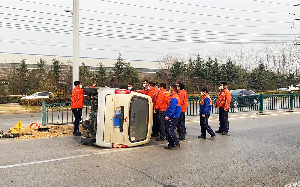 12月20日,魯西集團(tuán)下屬單位第七工程事業(yè)部門(mén)口就發(fā)生一樁驚悚而又讓人感動(dòng)的事件。此時(shí)臨近中午,正值員工就餐時(shí)間,只聽(tīng)“咣”的一聲巨響,一輛面包車(chē)疾馳撞向了道路隔離墩,車(chē)輛瞬間發(fā)生側(cè)翻。此時(shí)門(mén)衛(wèi)執(zhí)勤人員魏慶闊發(fā)現(xiàn)情況后,第一時(shí)間召集了準(zhǔn)備就餐的干部、員工十余人趕赴車(chē)禍現(xiàn)場(chǎng),迅速打開(kāi)主駕駛車(chē)門(mén),此時(shí)司機(jī)因受到驚嚇還未緩過(guò)神來(lái),身體被安全帶和車(chē)座卡住,前來(lái)營(yíng)救的員工協(xié)助司機(jī)解除障礙,并確認(rèn)司機(jī)意識(shí)和身體狀況后,及時(shí)將司機(jī)從側(cè)翻車(chē)輛內(nèi)救出。此時(shí)正值中午下班高峰期,如果當(dāng)時(shí)不能及時(shí)將司機(jī)救出,一旦發(fā)生其他車(chē)輛追尾,將釀成更加嚴(yán)重的后果。事后司機(jī)對(duì)公司見(jiàn)義勇為的行為既感動(dòng)又感謝,并向參與救援的魯西員工深深地鞠躬致謝。