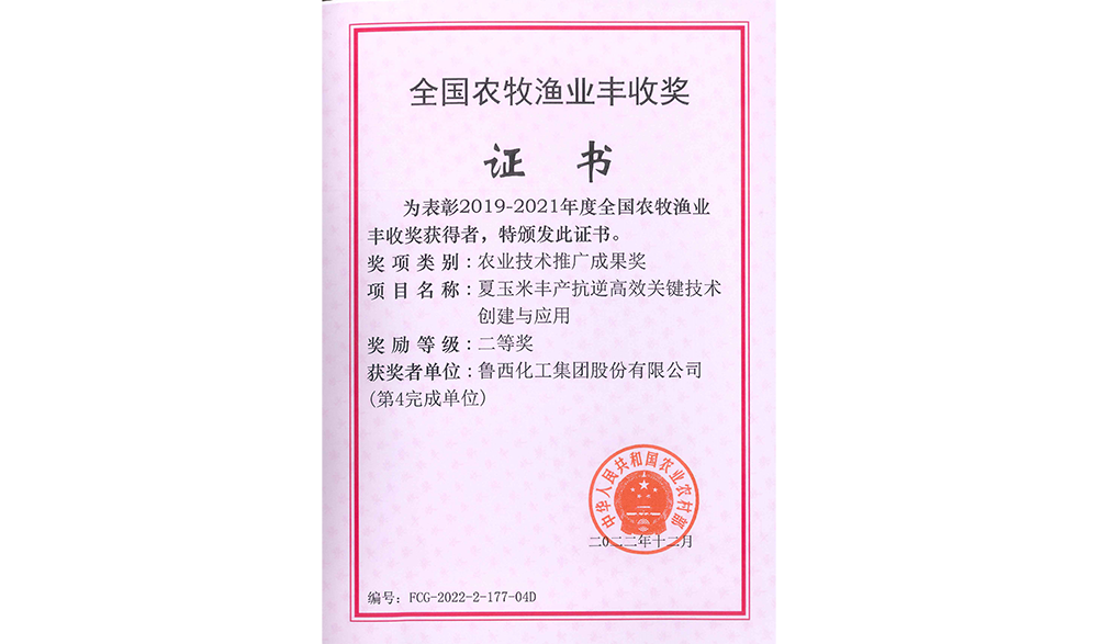 魯西化工集團股份有限公司聯(lián)合山東農(nóng)業(yè)大學深耕夏玉米豐產(chǎn)抗逆高效關(guān)鍵技術(shù)創(chuàng)建與應(yīng)用,2022年9月,利用公司尿素硝銨溶液和液體肥研究的夏玉米豐產(chǎn)抗逆技術(shù),被農(nóng)業(yè)農(nóng)村部授予農(nóng)業(yè)技術(shù)推廣成果獎二等獎,為保障國家糧食安全做出了重要貢獻。近日,該技術(shù)又喜獲“全國農(nóng)牧漁業(yè)豐收獎”。