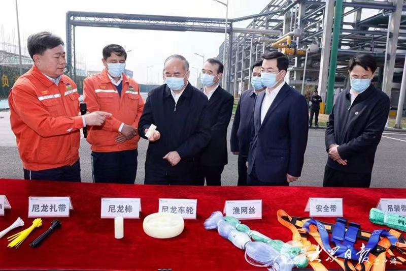 領(lǐng)導(dǎo)一行參觀了園區(qū)各生產(chǎn)裝置,并先后到己內(nèi)酰胺/尼龍6項(xiàng)目、有機(jī)硅項(xiàng)目建設(shè)現(xiàn)場(chǎng)和運(yùn)行指揮中心調(diào)研。參觀期間,張方向林武書(shū)記介紹了魯西集團(tuán)在加快發(fā)展化工新材料,建設(shè)智慧園區(qū)、綠色低碳園區(qū)方面的做法和優(yōu)勢(shì),匯報(bào)了發(fā)揮中國(guó)中化整體優(yōu)勢(shì),加快發(fā)展高端領(lǐng)域用聚碳酸酯材料和推進(jìn)二氧化碳化學(xué)利用方面的情況。