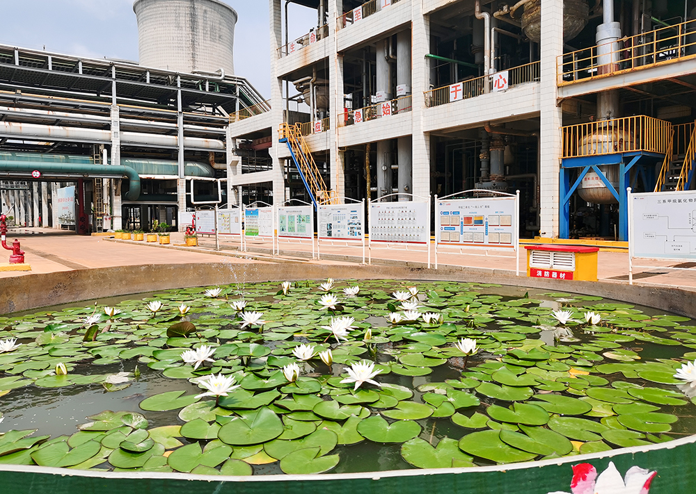 事業部甲烷一單元生產主任李佑飛對現場治理感觸也比較深:“您看,這些石榴冬青都是我們員工自己栽種的,它們的生長情況就能直接反映出環保治理水平。三個美麗的大魚缸,其實就是用生產廢棄的玻璃鋼罐切割后改造成的。魚缸外壁繪畫包括里面的噴泉、金魚、荷花都是大家各盡所能的成果。一說建設美麗生態化工園,干部員工的勁頭可大啦!”